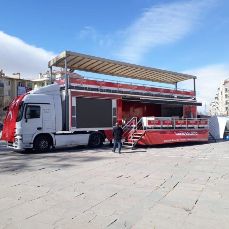 - Sahne ve Platform Alanı: Tırların iç kısmı, bir sahne veya platform olarak tasarlanabilir. Bu, adayların seçmenlere hitap etmelerini veya etkinliklerin yapılmasını sağlar.